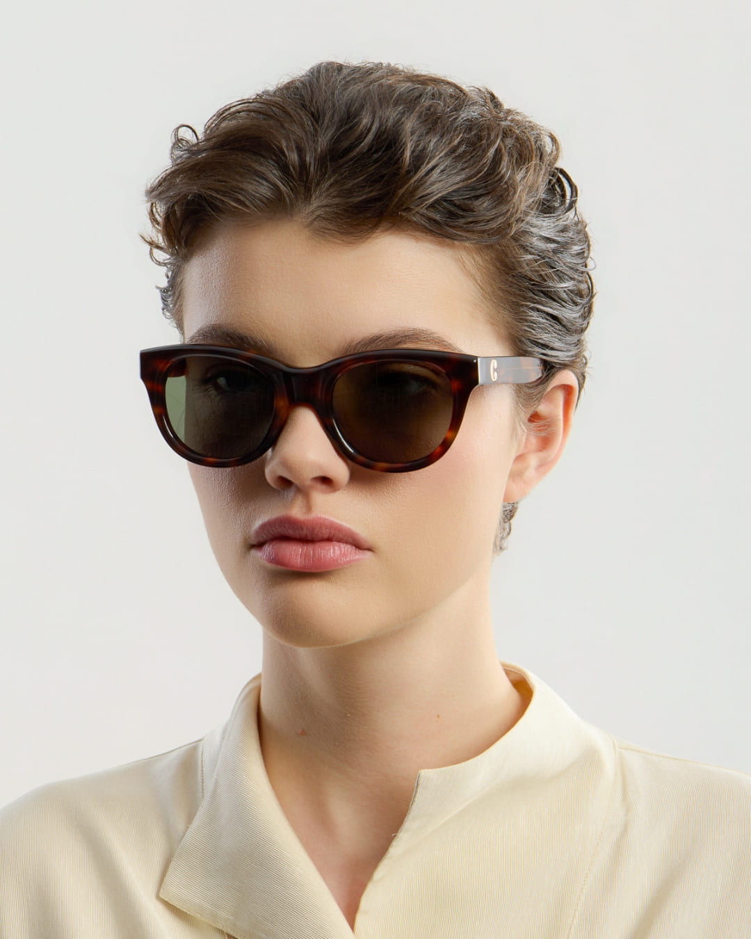 - Oversized silhuett med en subtil cat-eye-form